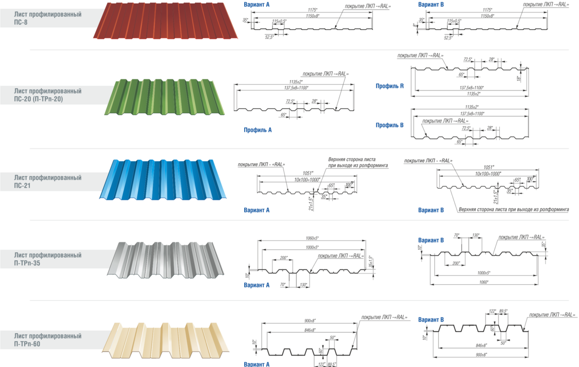Предлагаем профилированный лист следующих марок: ПС-8 (А, В), ПС-20 (A, B, R), ПС-21, НС-35, H-60.